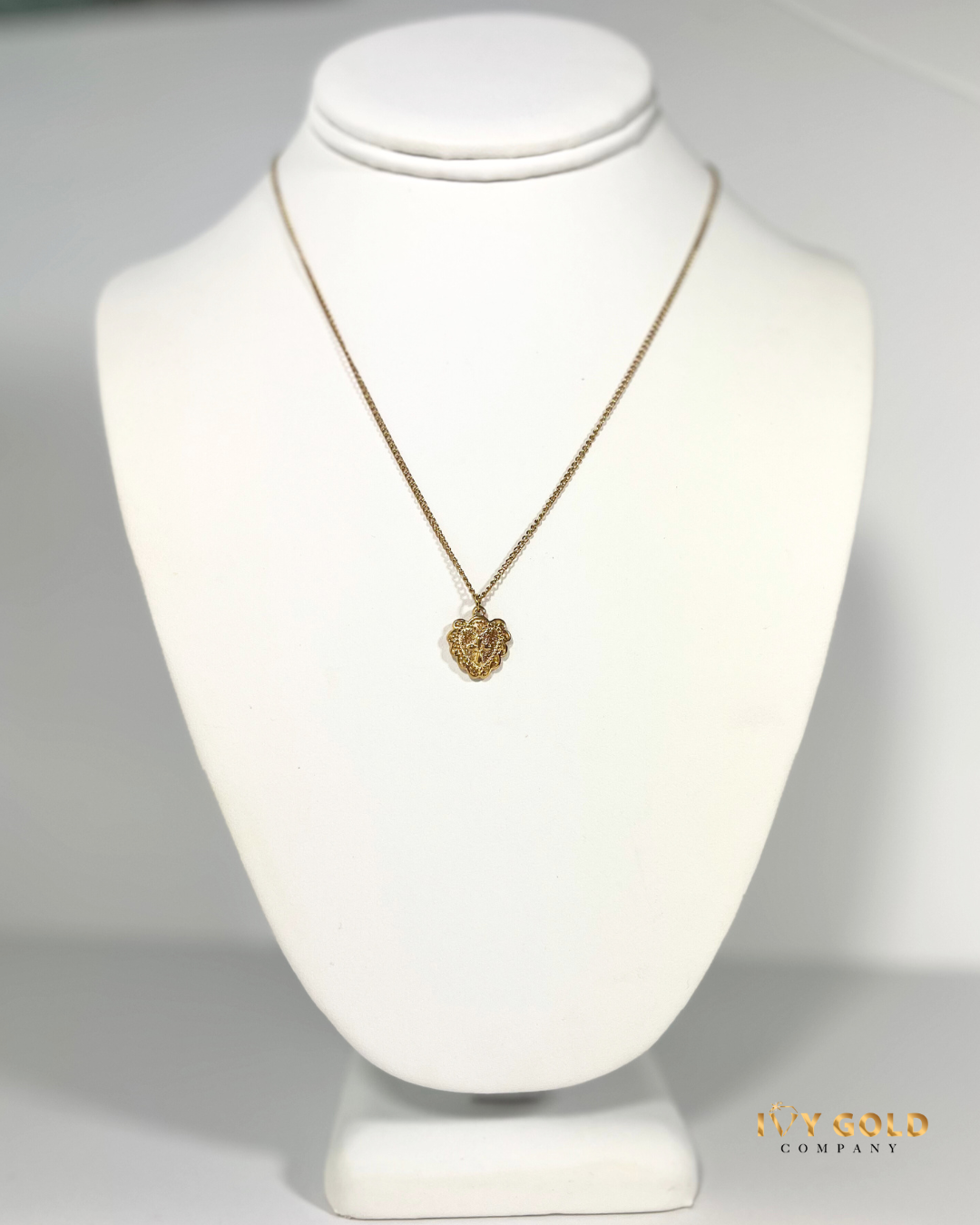 A delicate heart-shaped pendant with filigree detail and a centered cross, designed to symbolize love anchored in faith and a heart devoted to God.